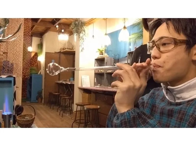 Air is added little by little to a small lump of glass that looks like starch syrup, making it into a round shape. The molten glass takes on a different appearance every second! It's an experience like no other.