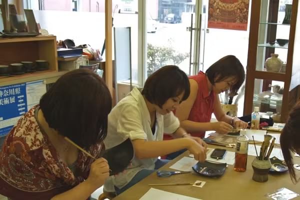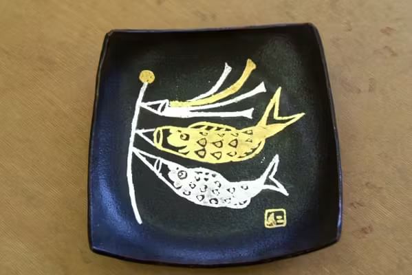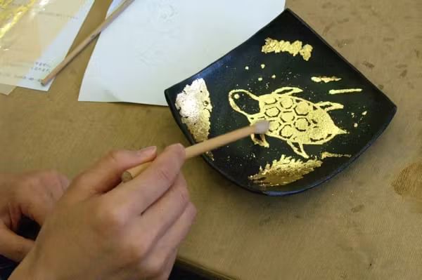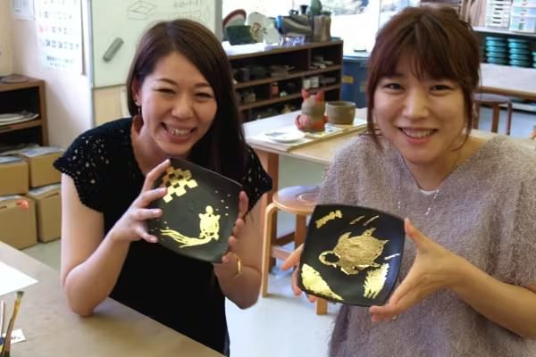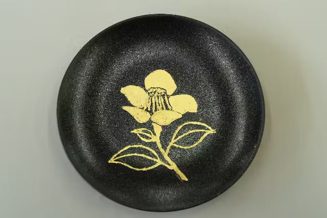 The gold leaf stands out on the black-brown plate.We use Do Pottery Museum's original 16cm square plate. A pattern is drawn on a black square plate using adhesive, and gold leaf ordered from Kanazawa is pasted on top. You can also draw detailed patterns and letters on it, so we recommend making it as a souvenir of your trip, or writing a message on it and giving it as a gift. The gold leaf stands out beautifully against the black background, creating a gorgeous plate. You can take it home right away on the same day, so you can enjoy displaying it in your home from the same day.