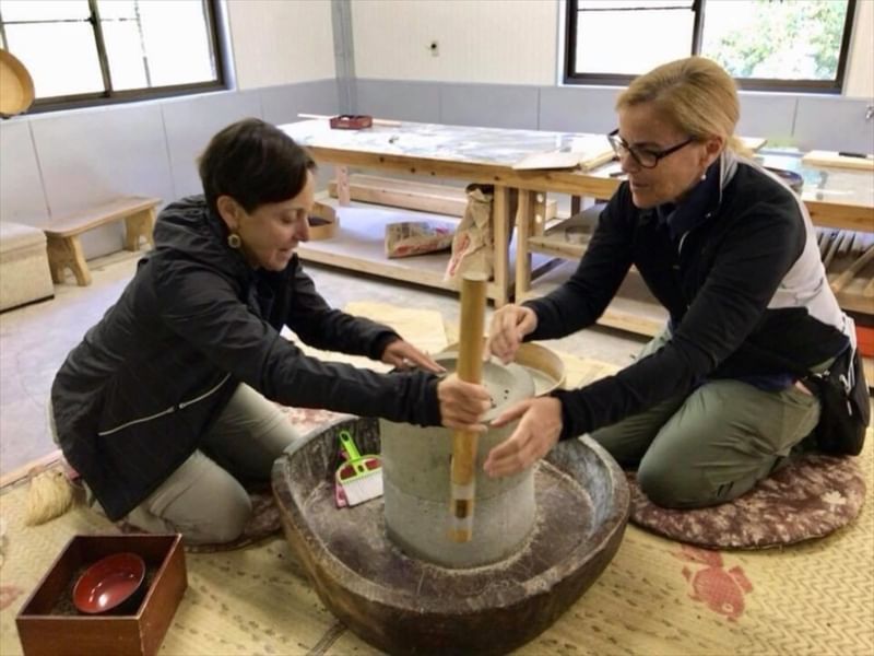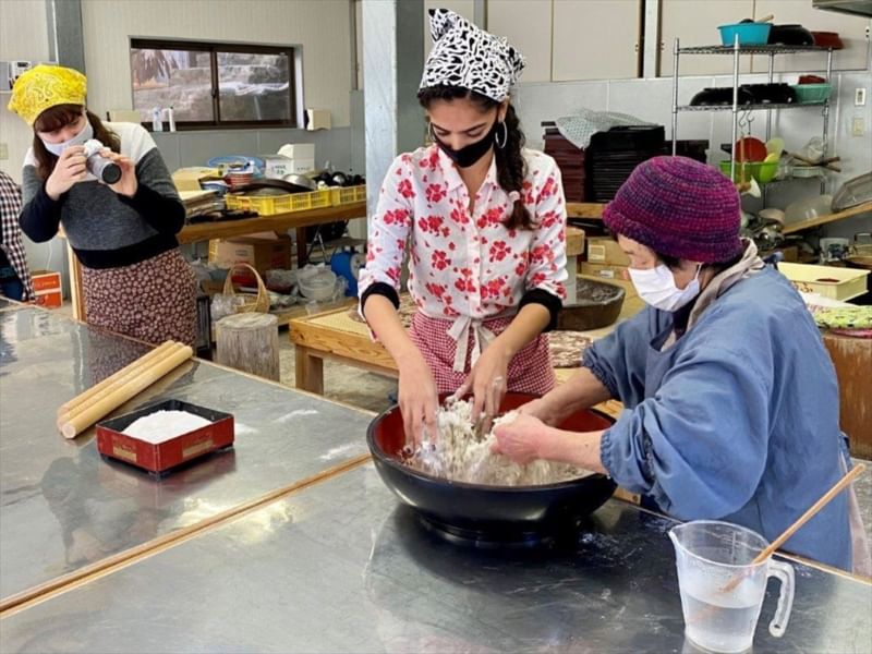 Venture into the mountains of Higashi-Iya’s beautiful countryside for this unique cooking experience with the locals. Grind buckwheat kernels from scratch to make soba flour and noodles, then enjoy them fresh with mountain vegetable tempura and other dishes that highlight the culinary delights of the region. As a special “dessert”, you can even hear a folk song sung live for you that tells the stories of the women of the past who milled soba flour in Iya.