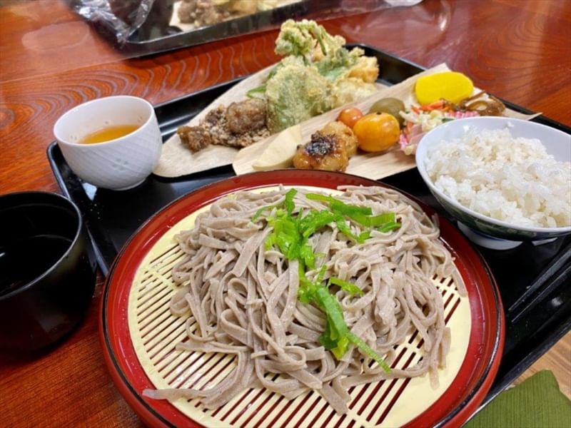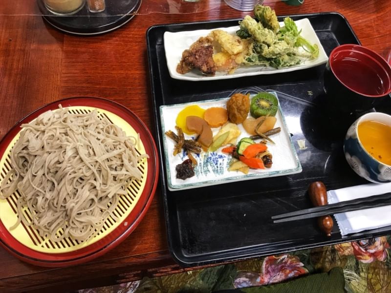 Soba making + lunch with mountain vegetable dishes (mountain vegetables, venison, potatoes, tofu, steamed mixed grain rice, etc.)