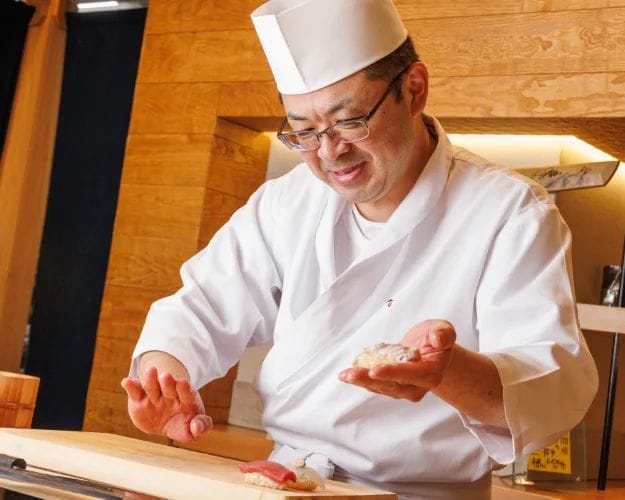 Its shari is made up of a proprietary blend of red vinegar made in-house, then mixed into fragrant and fluffy Koshihikari rice from the Aizu region in Fukushima. The restaurant’s signature dish of abalone with liver sauce is not to be missed either. The abalone is steamed in pure water and sake until impossibly tender, before the decadent liver sauce is laid over it.