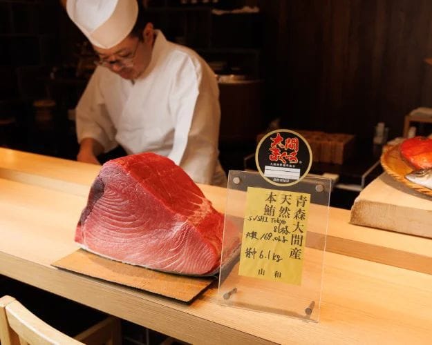 A sophisticated modern facade and bright neon signage belie the traditional Edomae sushi craftsmanship that lies within this Gotanda restaurant.