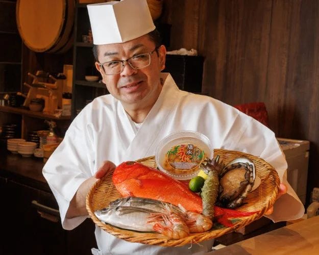 A vertically-slatted front window reveals a tantalizing glimpse of the interior where the Edomae magic happens. Stepping into the restaurant reveals a comfortable L-shaped counter, its light color a fashionable contrast to the restaurant’s dark walls and floor. Guests will be greeted by the brilliant smile and instantly disarming charm of the chef.