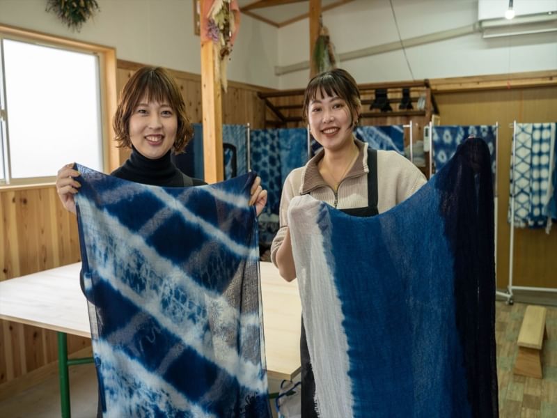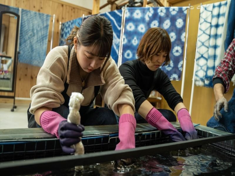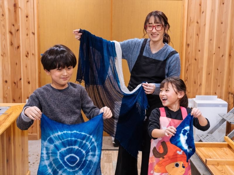 歡迎大型團體和家庭參加。靛藍染料裝在一個 900 公升 (237 gal) 的大鍋中,鍋深 160 公分 (5.2 ft)。春夏季節,您還可以欣賞附近藍染農場的風景,秋冬季則可以觀摩 sukumo(發酵藍染)的製作過程。讓自己沉浸在阿波藍的美麗與歷史中!