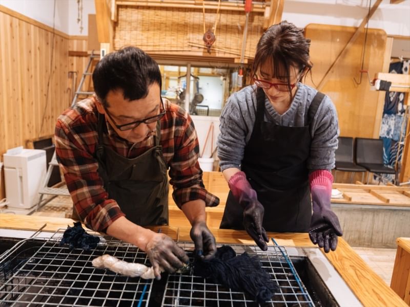 使用流傳數百年的技術,體驗使用萊葉發酵靛藍進行傳統藍染。