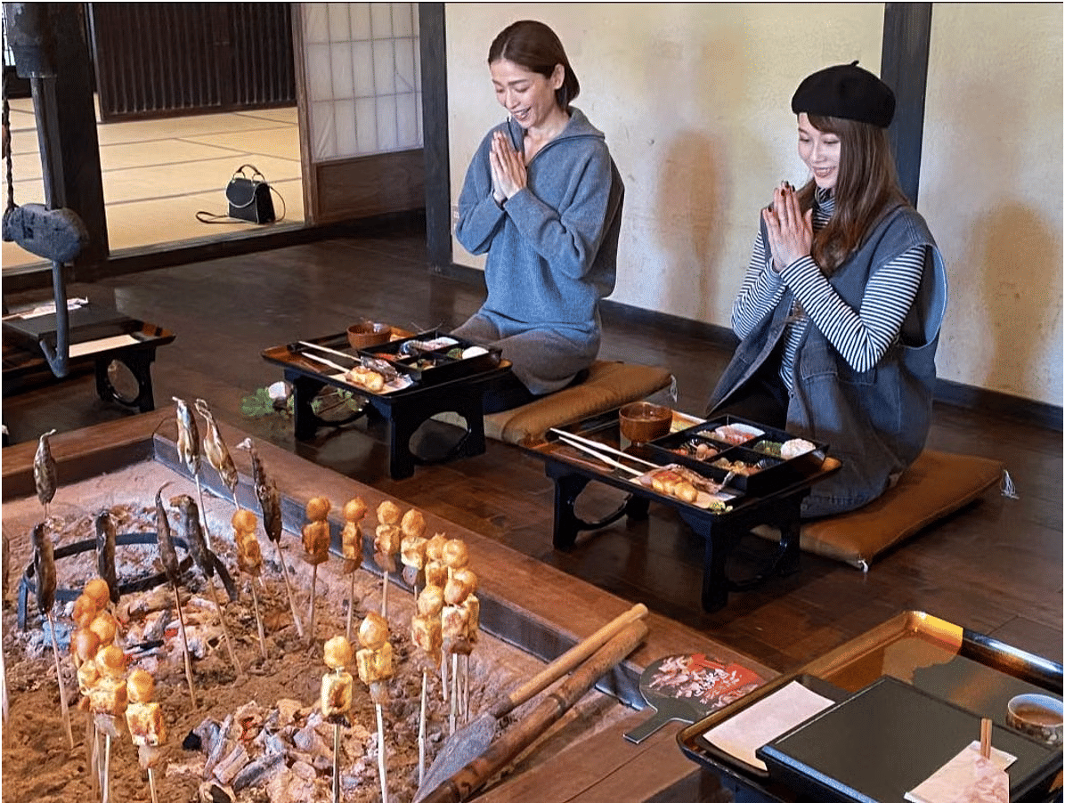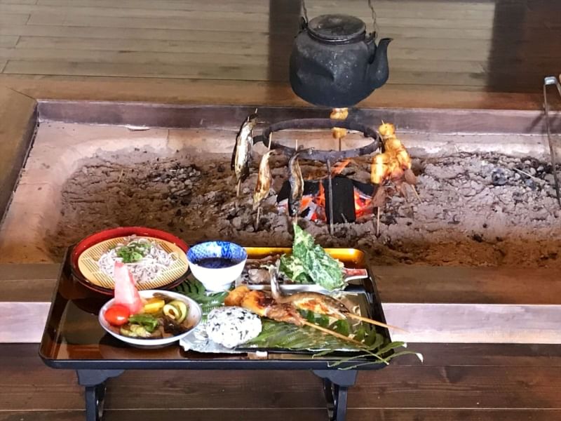 在約 250 年前建成的伊谷最大的武士宅邸中,您可以品嚐到在露天爐火中炭烤的傳統料理 - 來自附近清澈河流的奄列魚(鱒魚)、串燒原生馬鈴薯、硬豆腐(豆腐)和豆沙餡餅(果凍狀根菜餅)。此外,您還可以品嚐 Iya 的蕎麥麵、時令山菜天婦羅、炸鹿肉和蒟蒻,以及在陡峭山坡上以傳統方式耕種的各種當地新鮮蔬菜。所有料理都經過簡單烹調,以發揮每種食材的最佳風味。